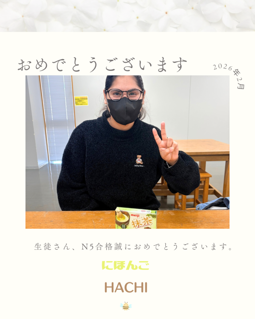 2つめも、なんと!生徒さんが、昨年末のJLPTの試験で、N5に合格されました。学習には個人差がありますので、こちらも詳細は秘密です。